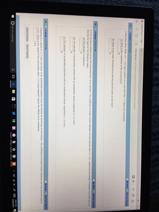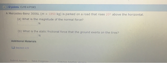 43 A Mercedes Benz 300sl M 1700 Kg Is Parked On A Road That Rises 15 Above The Horizontal What Are The Magnitudes Of A The Normal Force And B The Static Frictional Force That The Ground Exerts On The Tires Ph 201 Homework Chapter 4 Solutions Dr